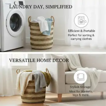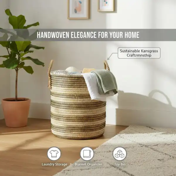 Discover a beautiful and functional way to organize your space with this Handwoven Kans Grass Laundry Basket with Lid & Handles. Crafted from natural kans grass fibers, this cylindrical basket combines earthy texture with practical design, making it perfect for laundry, blankets, toys, linens, or everyday storage.