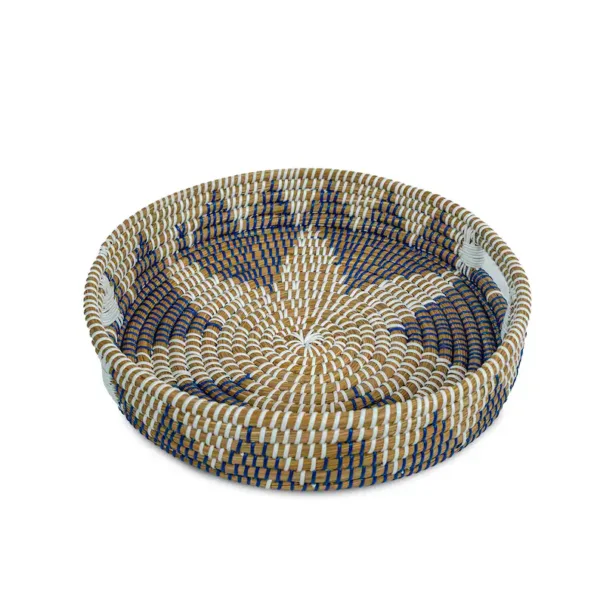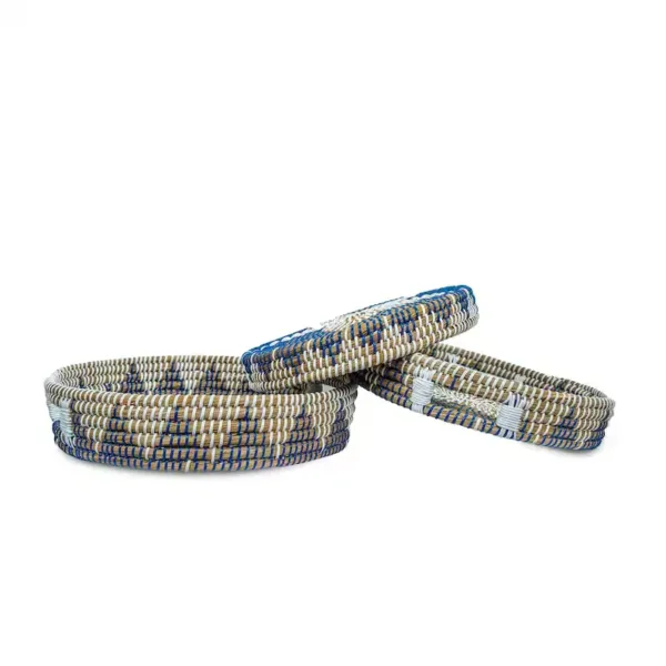 Handwoven from sustainable kansgrass and accented with rich blue detailing, this tray set blends natural texture with relaxed elegance. Each tray is carefully crafted by hand, creating subtle variations in weave and color that make every set truly one of a kind. Designed to be both functional and decorative, these trays bring warmth, depth, and authenticity to your home, whether styled on a coffee table, used for serving, or organizing everyday essentials. Rooted in tradition and made for modern living, this set reflects conscious design, skilled craftsmanship, and timeless beauty.