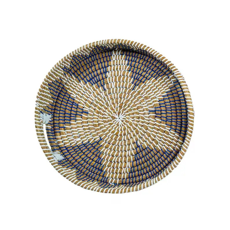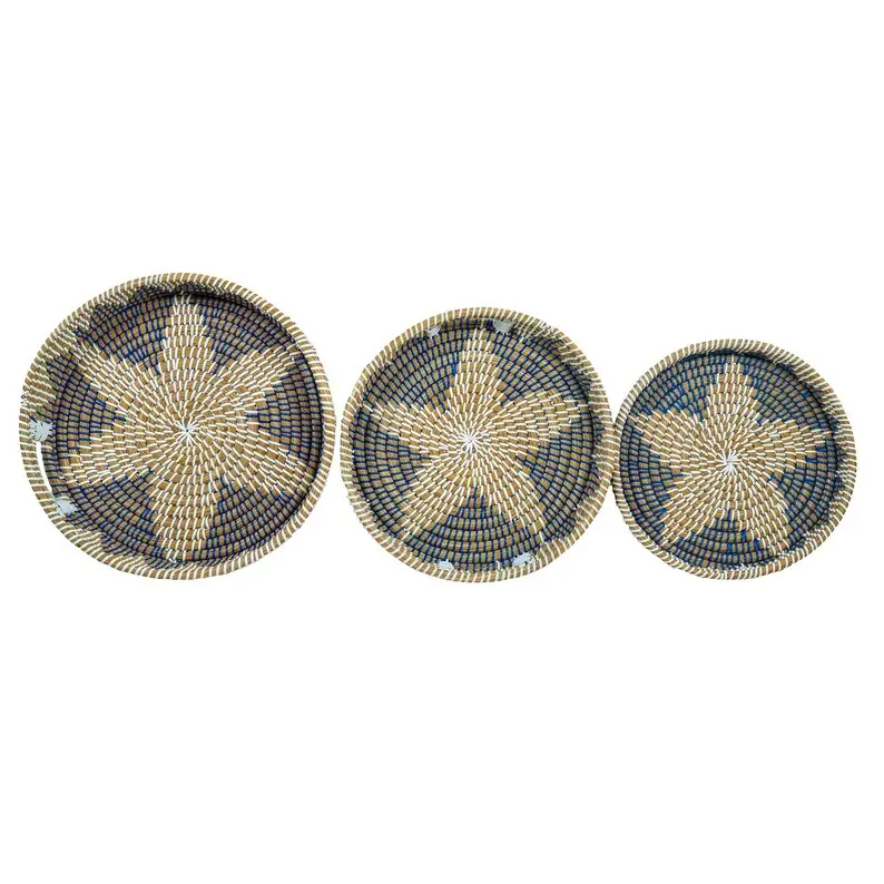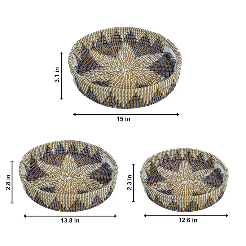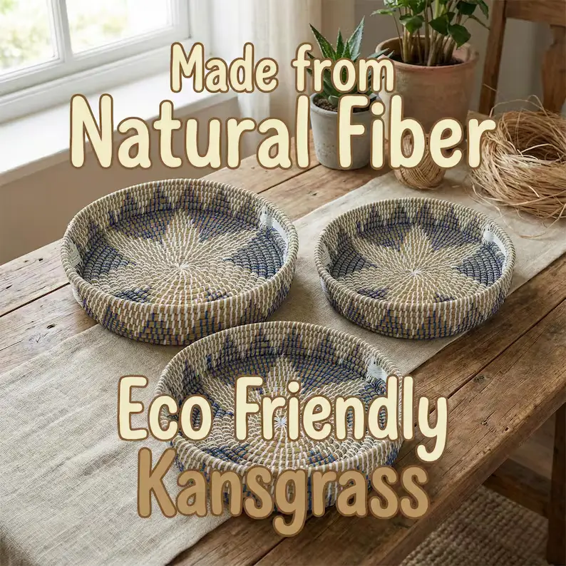 Handwoven from sustainable kansgrass and accented with rich blue detailing, this tray set blends natural texture with relaxed elegance. Each tray is carefully crafted by hand, creating subtle variations in weave and color that make every set truly one of a kind. Designed to be both functional and decorative, these trays bring warmth, depth, and authenticity to your home, whether styled on a coffee table, used for serving, or organizing everyday essentials. Rooted in tradition and made for modern living, this set reflects conscious design, skilled craftsmanship, and timeless beauty.