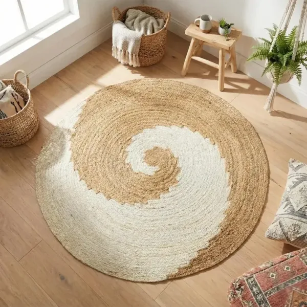 Introduce refined texture and visual intrigue into your home with this Jute Two-Tone Spiral Pattern Round Mat. Carefully handwoven from 100% natural jute, its intertwined spiral design creates a sculptural focal point that adds depth and movement to any room.